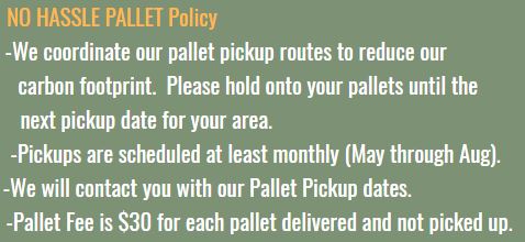 - Customers are responsible for pallets delivered, until pickup by Sodfather.